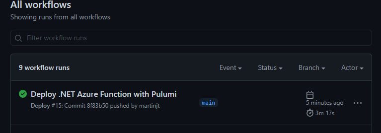 Deploying an Azure function with Pulumi is pretty easy, adding in the complexity of Github Actions/Workflows is actually pretty easy too. There are a few incantations that you need in order for the Action to access azure, but other than that, it was fairly smooth sailing.